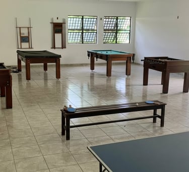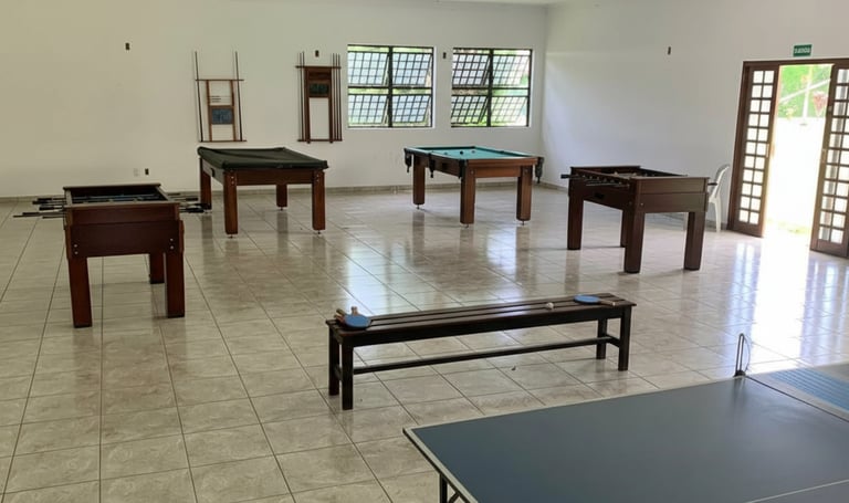 Ambiente descontraído com sala de jogos, ideal para entretenimento de adultos e crianças durante eventos e confraternizações.